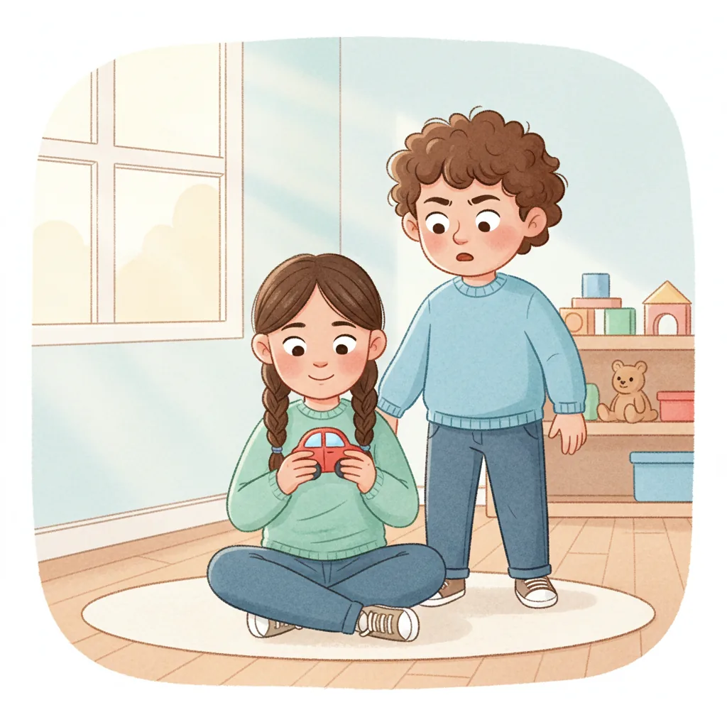 My friend Mia was playing with the car. I felt excited but also a bit unsure.