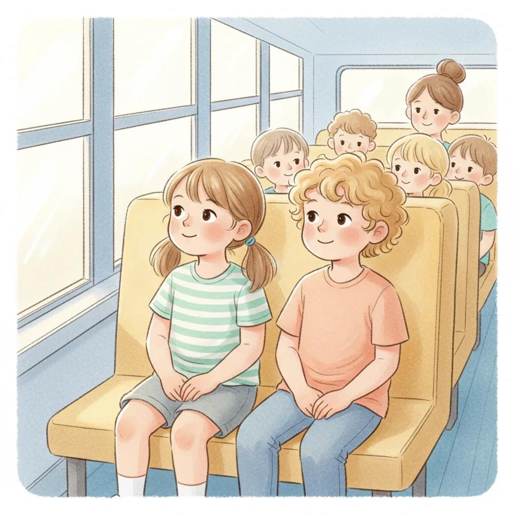 We ride the bus. I sit with my friend.